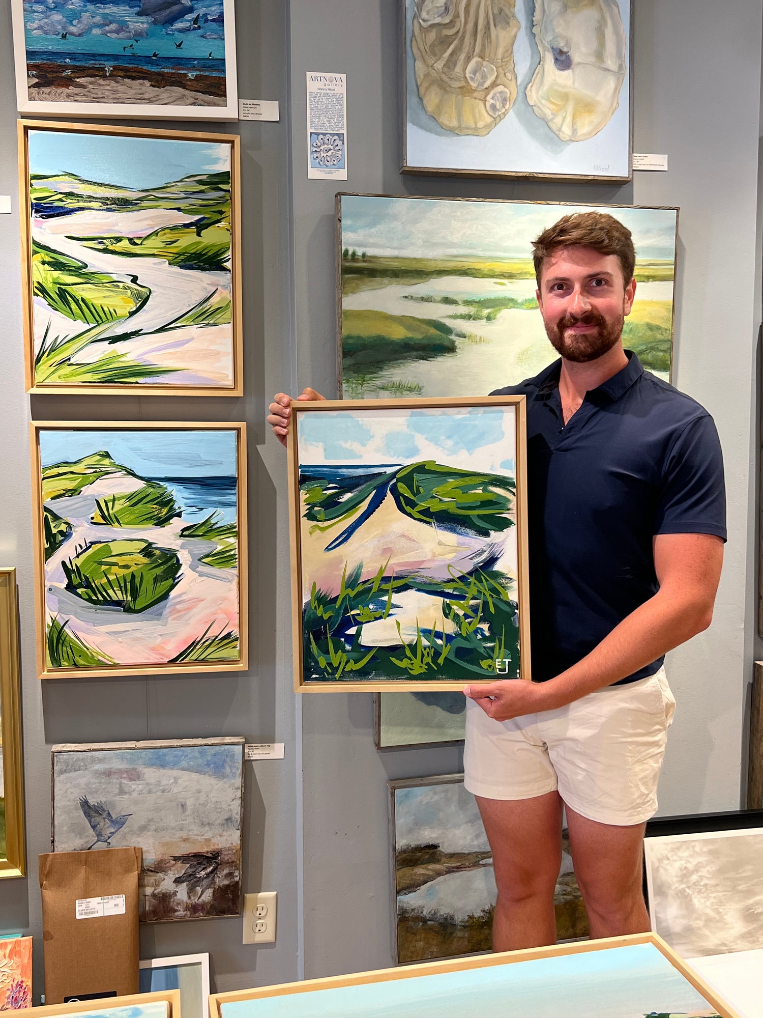 Erik Jacobson is an artist based in Orleans, Massachusetts, whose work is deeply inspired by the flowing dunes and shifting light of the Outer Cape. Drawing on a family legacy that includes his great-grandfather Arthur Belliveau and his father’s cousin, the renowned painter Will Cotton, Jacobson’s practice blends tradition with a contemporary sensibility. He began studying fine art at an early age at the Interlochen Center for the Arts and later apprenticed with acclaimed sculptor Omri Amrany. Since beginning his professional career at 21, Jacobson has developed a visual language rooted in place, memory, and movement. His work can be seen at Artnova in Chatham and Treadwell Gallery in Provincetown, as well as online at www.erikjacobson.art and on Instagram @erikjacobsonart.